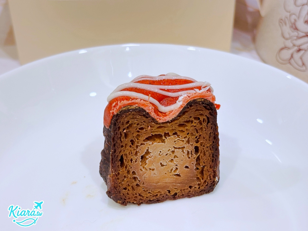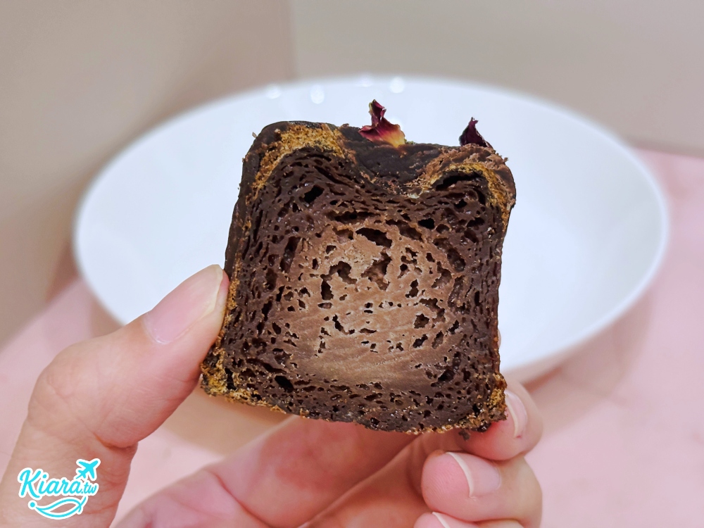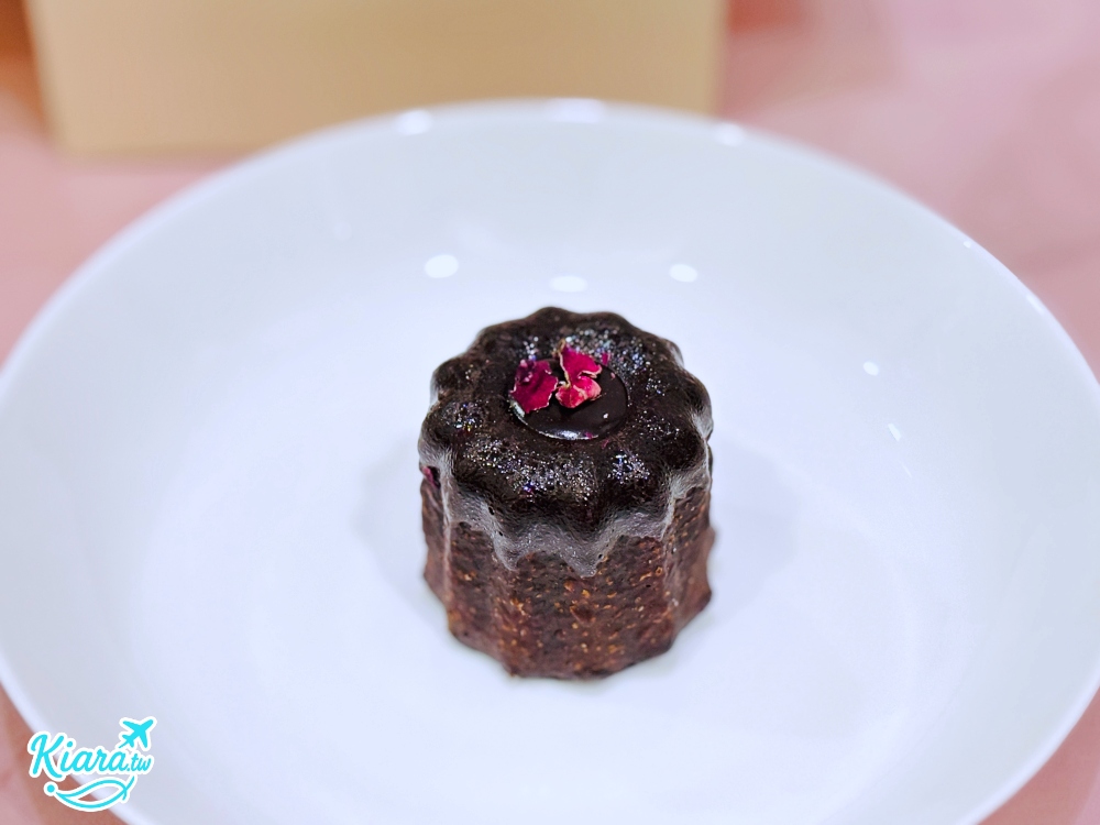 經典的巧克力可麗露口味,店家使用佳麗寶72%黑巧,再帶點玫瑰裝飾,巧克力味道很濃郁,巧克力綜合了可麗露的甜味,如果一次沒吃完,只要冷凍退冰個15~20分鐘就很好吃。