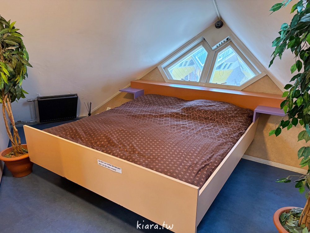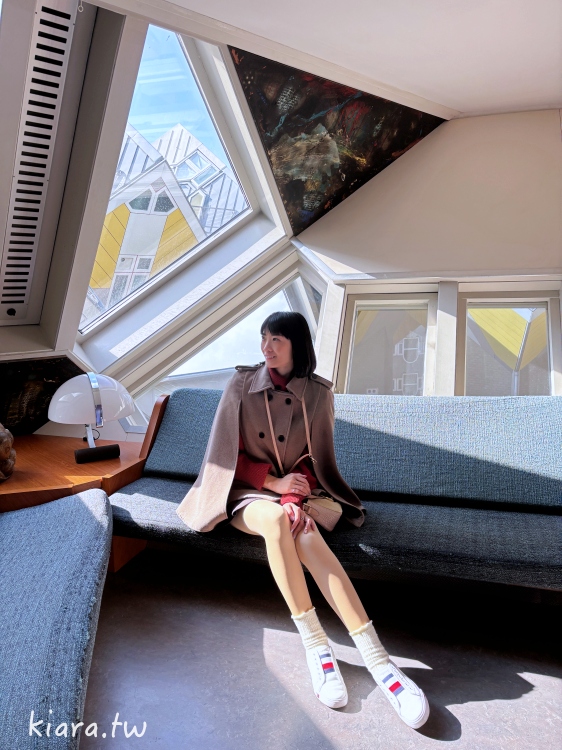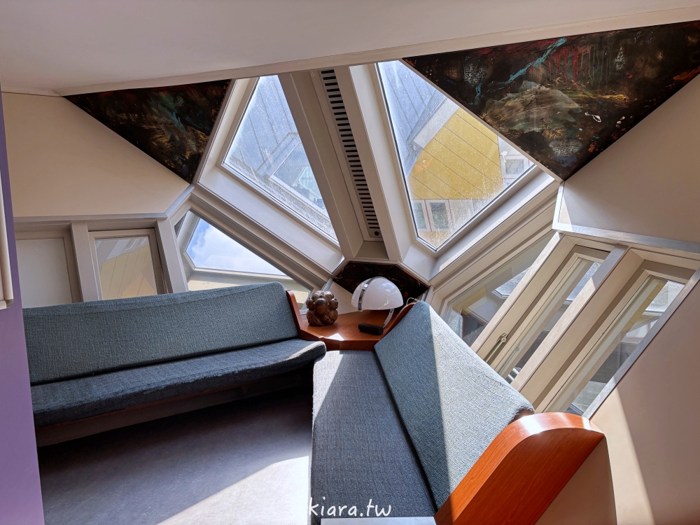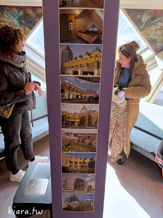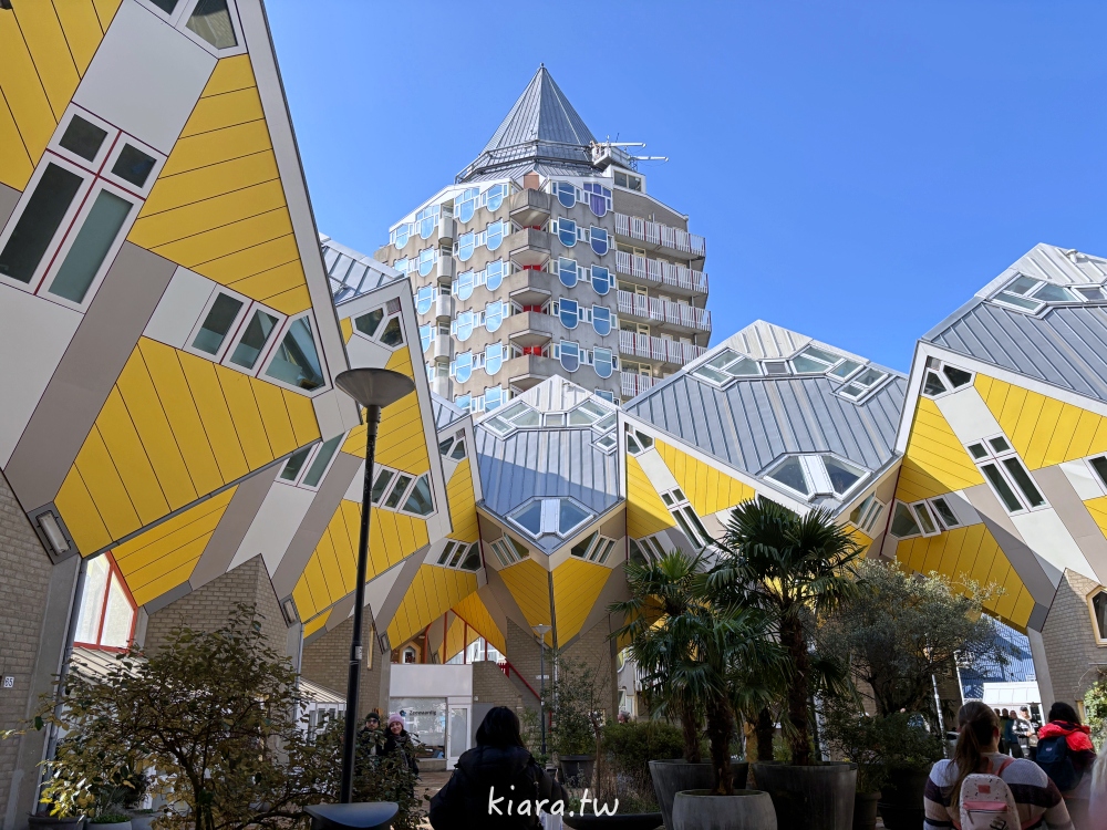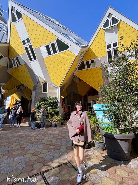 遠遠的看方塊屋,就是非常顯眼的建築,方塊屋的設計師Piet Blom 說:「如果城裡有森林,那每棟房子就是一棵樹。」住戶生活在藝術中,城市也因而更加趣味化。每一棟房子都像是倒立的方塊,45度傾斜的結構,外觀以鮮黃色搭配灰白色線條,非常醒目的造型,適合拍照打卡的地方,而這麼多間的方塊屋,僅有一間有開放入內參觀,但其中也有部分方塊屋已經改建成青年旅館,因此要在方塊屋住一晚體驗看看也是另一種選擇。