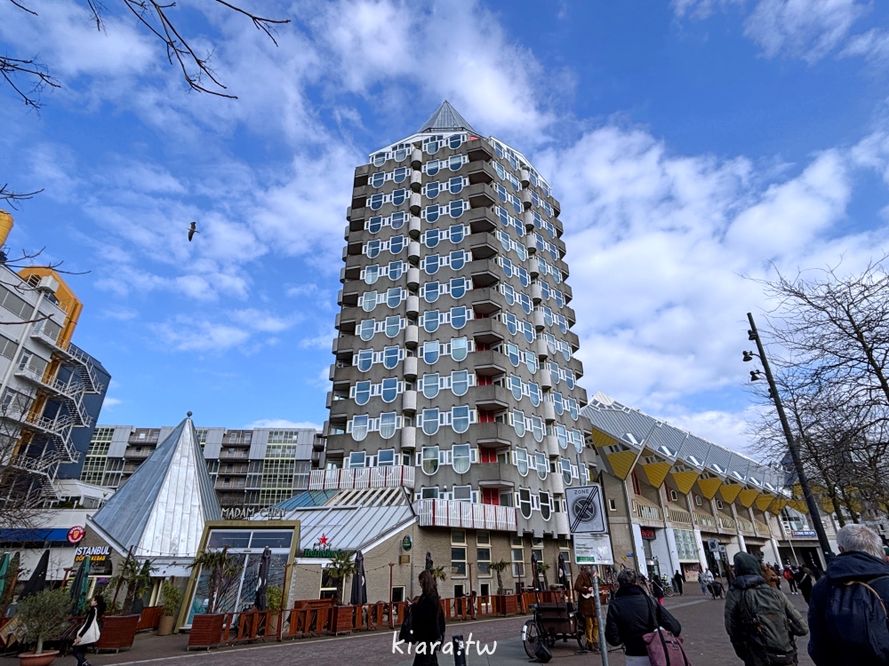 鹿特丹鉛筆屋就在方塊屋的旁邊而已,真的非常的近,不過鉛筆屋是一間住宅大樓,只能從外邊拍拍這個造型像鉛筆的建築,同樣都是荷蘭建築師Piet Blom設計,建議由方塊屋前方或者 Markthal(拱廊市場)旁視角拍攝,能將鉛筆屋+方塊屋同框。