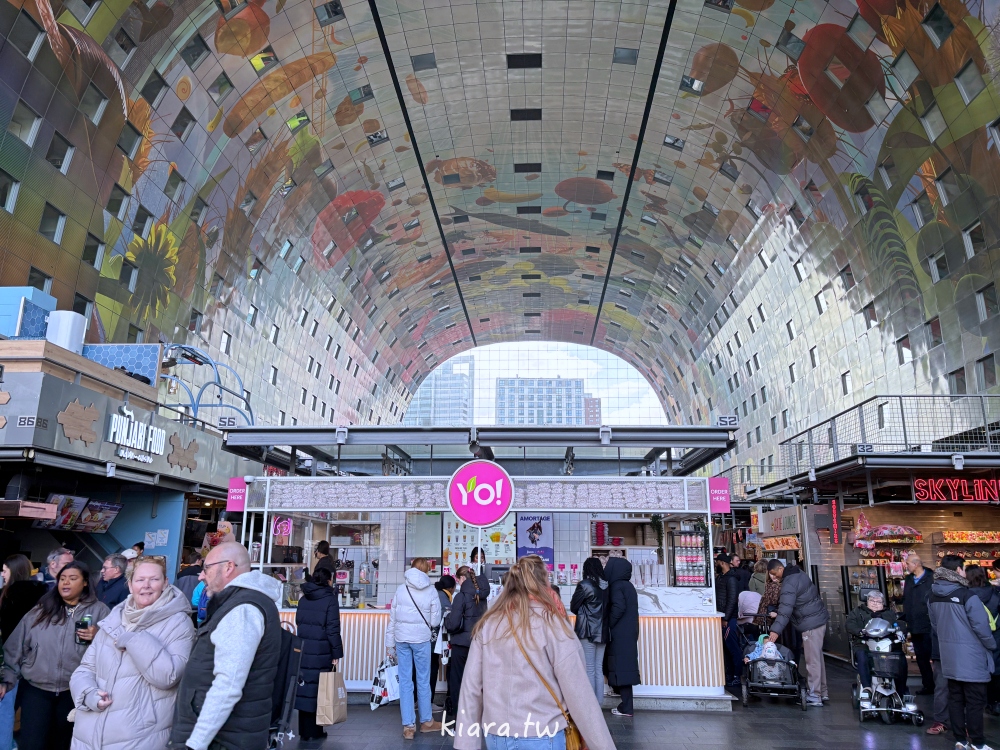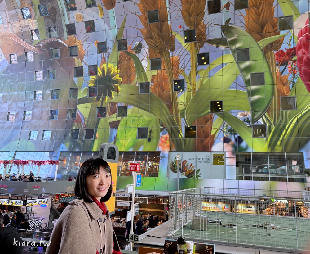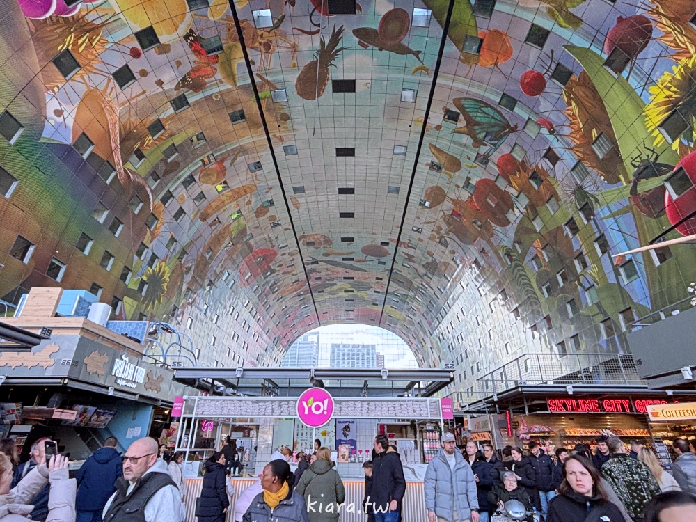 鹿特丹Markthal拱廊市場是2014年開幕的現代化市場,由荷蘭知名建築設計事務所MVRDV所設計,裡面有將近100個以上的攤位,也包含了餐廳、住宅、超市、停車場,是一間複合式多功能的建築,整棟建築呈現巨型的馬蹄形拱廊,內側是彩色壁畫覆蓋,被譽為『世界最美的菜市場』。室內天花板是由 Arno Coenen 與 Iris Roskam 創作的巨型壁畫,以水果、蔬菜、魚類、花卉等象徵「豐收」的元素呈現,是 Markthal 最具代表性的藝術品。